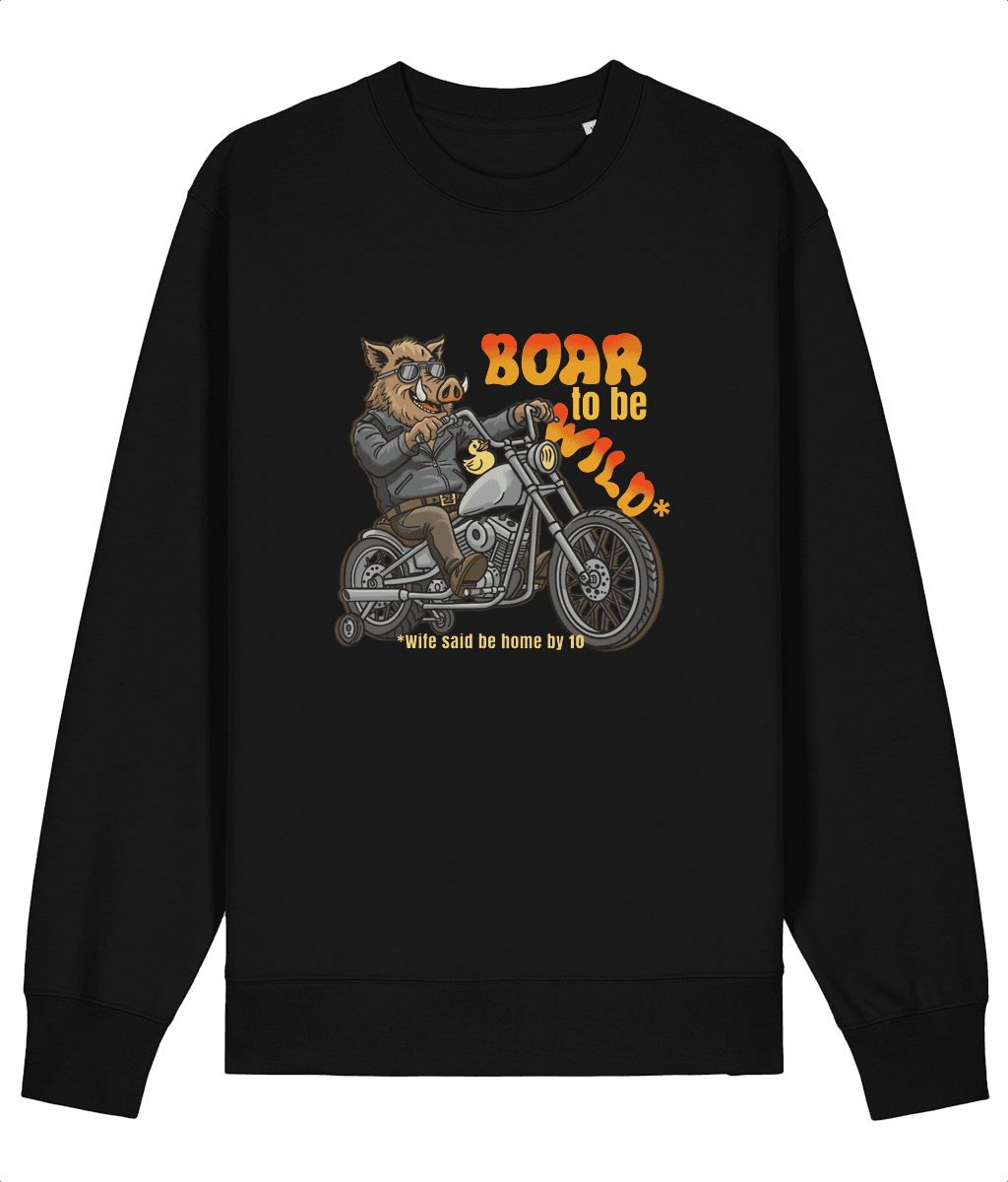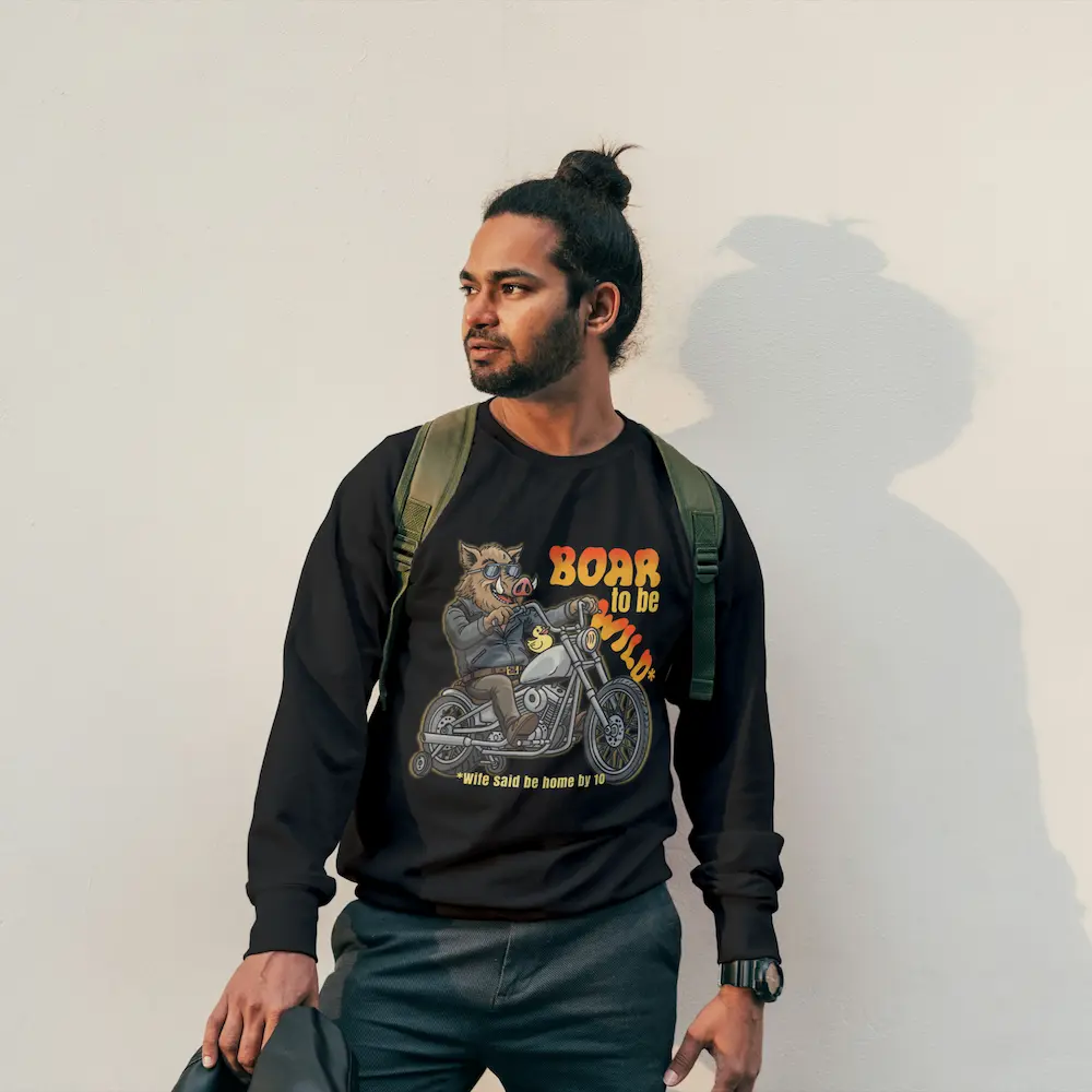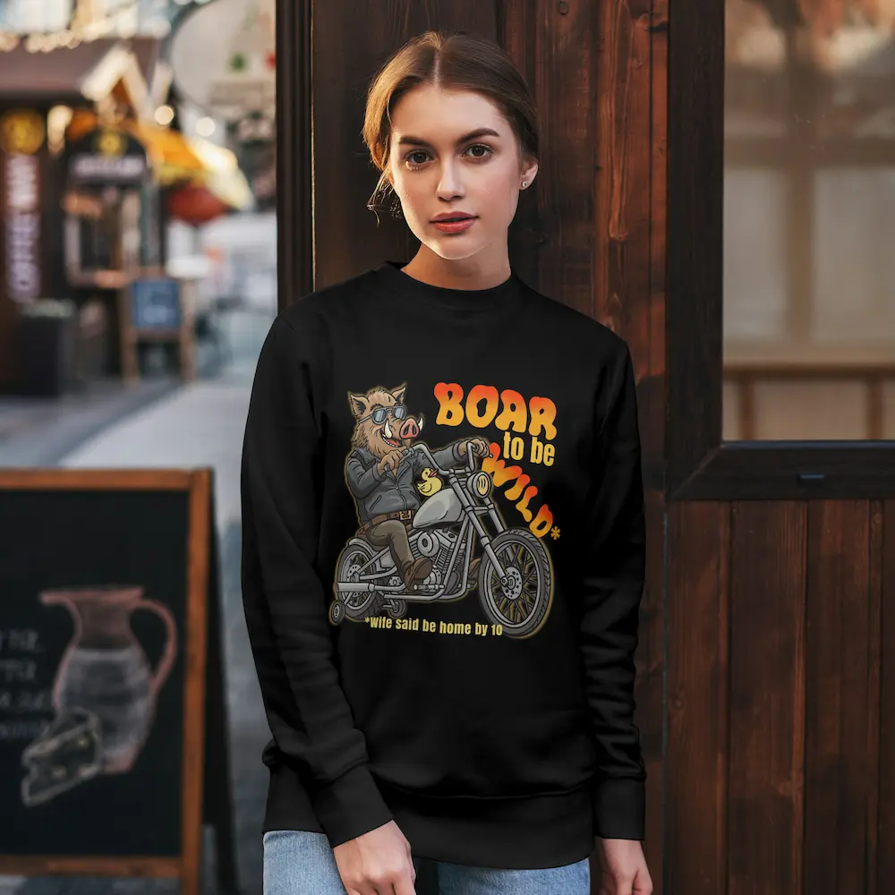 Un mistreț „fioros” pe un chopper dotat cu roți ajutătoare și o rățușcă de cauciuc pentru siguranță maximă. E portretul perfect al „sălbaticului” care face zgomot pe stradă, dar intră în casă în vârful picioarelor la ora 10 fix. Boar to be Wild – Contrastul suprem între dorința de libertate și realitatea crudă a „permisiei” de la soție.