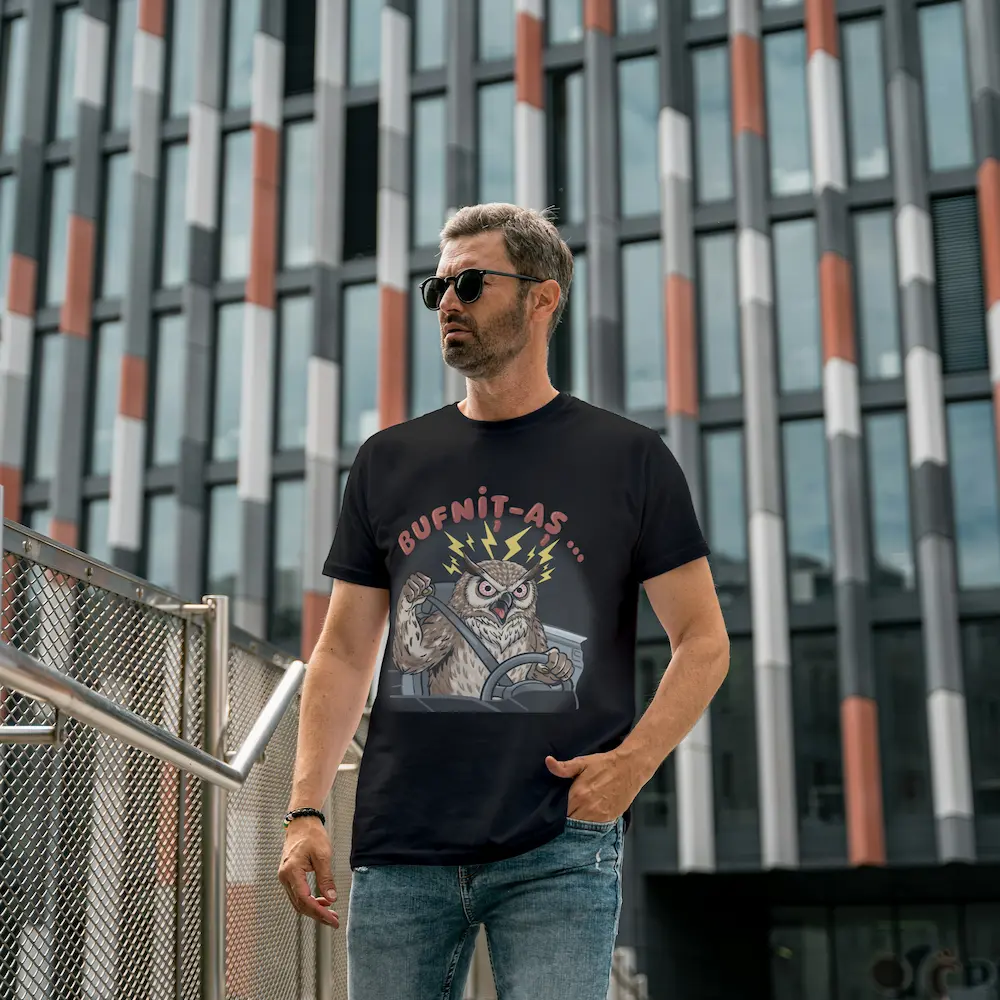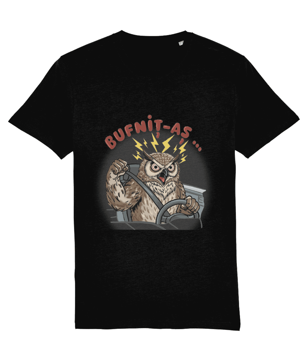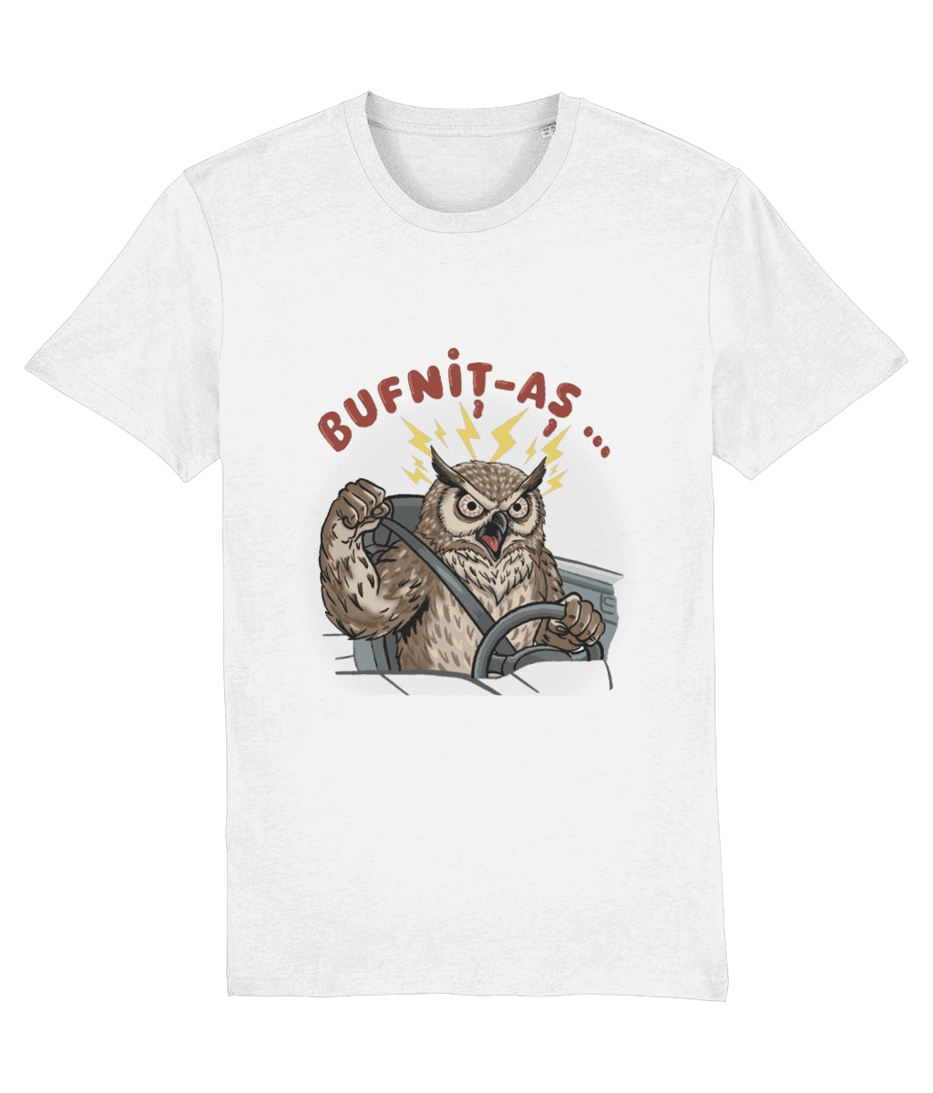O bufniță nervoasă, cu ochii injectați, domină designul sub mesajul „Bufniț-aș…”. Ilustrația surprinde vârful road rage-ului: o gheară strânge disperat volanul, în timp ce cealaltă este ridicată într-un pumn amenințător. Detaliile precum fulgerele de tensiune și centura (siguranța înainte de toate, chiar și când înjuri în gând) completează tabloul.