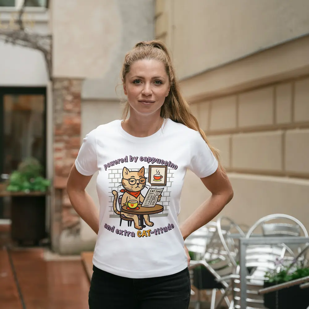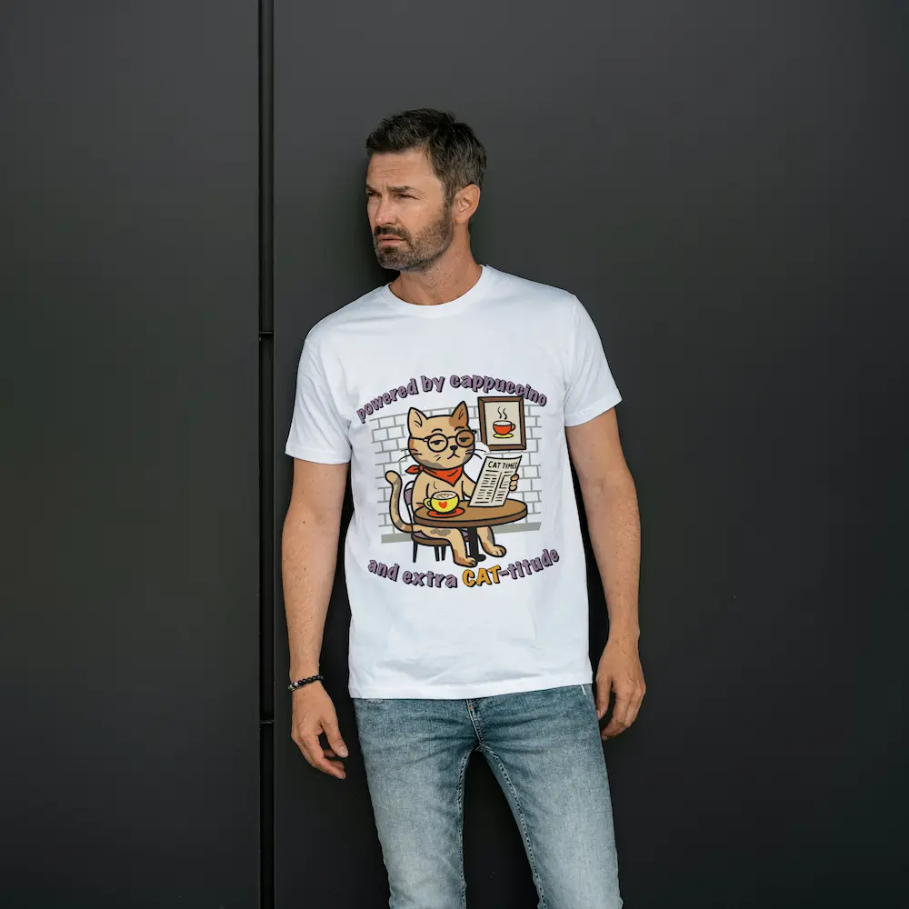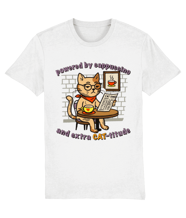 O pisică extrem de zen care își savurează momentul de singurătate la o cafenea, cu ziarul în față și cana strategic plasată. Mesajul „Powered by cappuccino and extra CAT-ittude” este bătut în fonturi clare, fiind un avertisment prietenos pentru oricine ar îndrăzni să-ți strice liniștea cu „small talk”.